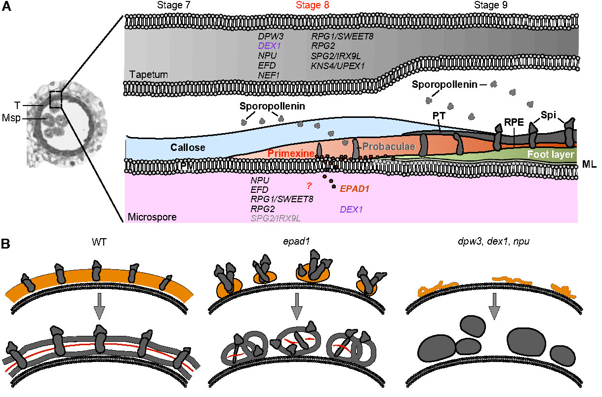 A.植物花粉外壁形成过程和已知参与初生外壁形成基因的表达特征,其中EPAD1特异地在小孢子母细胞和早期小孢子中表达,其他已报道基因在花药壁细胞层绒毡层中特异表达或是在绒毡层和小孢子中同时表达。B. 不同初生外壁形成相关基因的作用:水稻野生型(WT)花粉中孢粉素组装形成连续双层花粉外壁结构,水稻EPAD1突变使初生外壁变得不连续,初生柱状层分布不均最终形成分离的环状外壁结构;其他已知初生外壁相关基因突变导致初生外壁不能形成或变薄,孢粉素不能沉积到小孢子表面,在小孢子外形成无序聚集团块。
