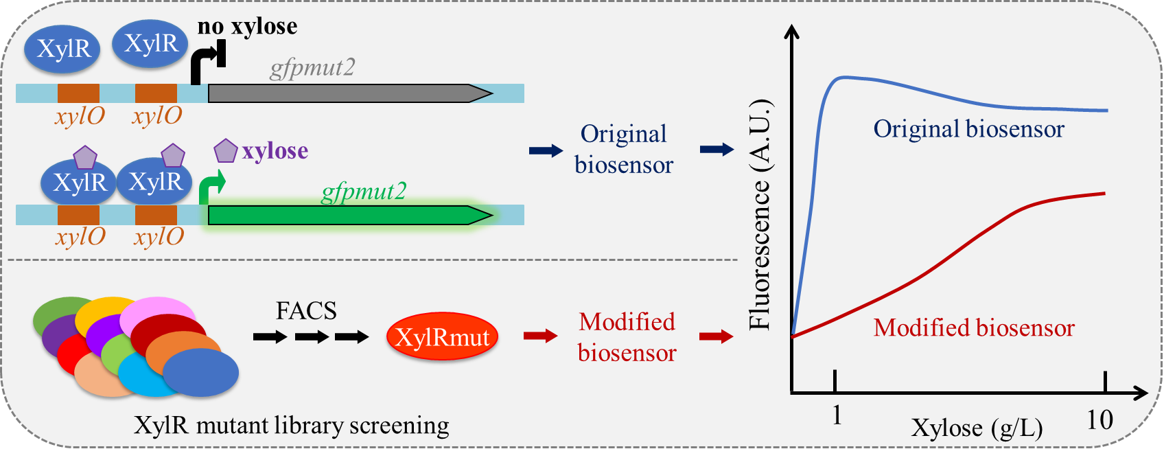 近年来,针对不同底物或代谢产物所设计的各种生物传感器(biosensor)被广泛应用到菌株选育中。然而,目前所报道的木糖传感器的,其木糖浓度响应范围非常有限,在较低的木糖浓度下即达到饱和,无法很好响应培养基中发酵条件下的木糖浓度,限制了这些生物传感器在高通量筛选菌株中的应用。因此,构建具有较大梯度响应浓度的木糖感应器对于高效筛选菌株具有重要意义。