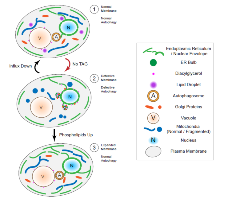 谢志平课题组在2015年首次发现了三酰甘油合成与细胞自噬的关系。当三酰甘油合成被阻断后,自噬途径发生异常。国际上曾经有各种三酰甘油调控细胞自噬机制的假说被提出来。一段时间里,曾有人认为脂肪酸积累是抑制自噬发生的主要原因。然而,BMC Biology新发表的这项研究成果表明脂肪酸的作用是间接的,更直接的原因是代谢途径中二酰甘油积累。这一结论源于上海交大/苏大研究团队对细胞结构更全面的观察。为此,谢志平课题组首先系统地开发了酵母中各个细胞器的标志蛋白荧光标签,这是迄今为止最完善的酵母的细胞器标记体系。该项成果已于2019年发表在mBio上。利用这套工具,上海交大/苏大研究团队发现三酰甘油合成阻断后,其前体二酰甘油积累,严重影响了酵母细胞的内膜系统,使得内质网、高尔基体等重要细胞器出现严重异常,最终导致细胞自噬缺陷。用多种方法减少二酰甘油供应或增加二酰甘油消耗时,都可以看到内膜系统的恢复和细胞自噬的恢复(图1)。该项研究提示二酰甘油这一经典代谢分子具有尚待解析的新功能,为理解代谢异常对健康的影响和疾病的治疗提供了新的视角。