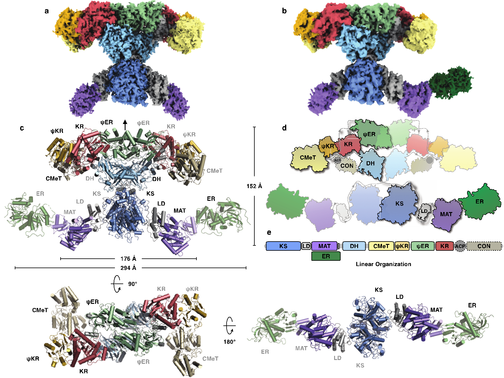 二氢莫纳可林 L(DML)作为洛伐他汀的母核,由高度还原型迭代式聚酮合酶 (HR-iPKS) LovB, 以及反式作用的烯酰基还原酶LovC共同合成。单体分子量为335 kDa的LovB含有连续的七个结构域,经过9轮循环, 催化约35步生化反应。在催化过程中,LovB变换自身结构域的使用组合方式, 在各轮循环中对中间产物进行不同程度的修饰;起“把关”作用的LovC与LovB形成蛋白质复合物, 确保终产物DML的正确合成。然而,高分辨率LovBC复合物结构信息的缺乏,障碍了人们进一步理解该巨型合酶的催化机制。例如,LovB如何迭代且编程式的执行其催化功能? LovC与LovB 之间如何形成相互作用关系?