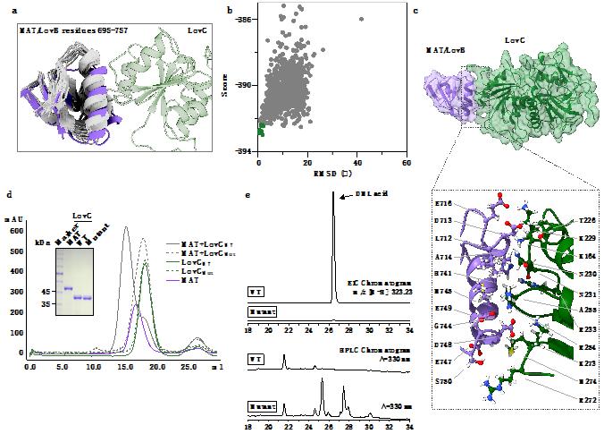 LovC在洛伐他汀合成过程中起关键性 “把关” 功能。研究团队以LovBC复合物的冷冻电镜密度图为基础, 通过计算机对接模拟实验,精确解析LovB-LovC之间的相互作用界面。 通过对双界面的点突变实验及突变后正确底物DML消失的观察,首次在蛋白质结构层面论证LovBC复合物完整催化腔体对终产物正确合成的必要性(图2)。