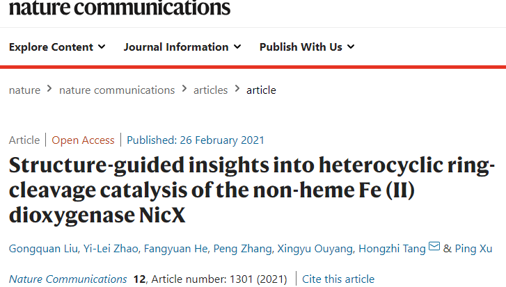 近日,det365登录网站主页、微生物代谢国家重点实验室微生物分解代谢团队的唐鸿志教授与赵一雷教授等合作在国际权威期刊《Nature Communications》在线发表了题为“Structure-guided insights into heterocyclic ring-cleavage catalysis of the non-heme Fe (II) dioxygenase NicX”的研究论文(https://www.nature.com/articles/s41467-021-21567-9),揭示了非血红素亚铁双加氧酶(NicX)的催化反应机理。