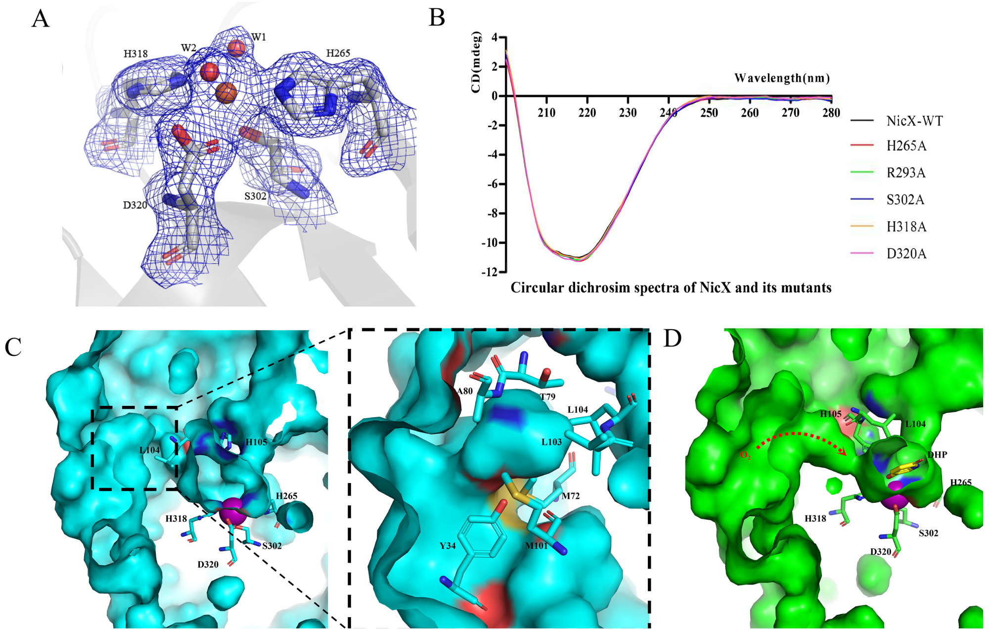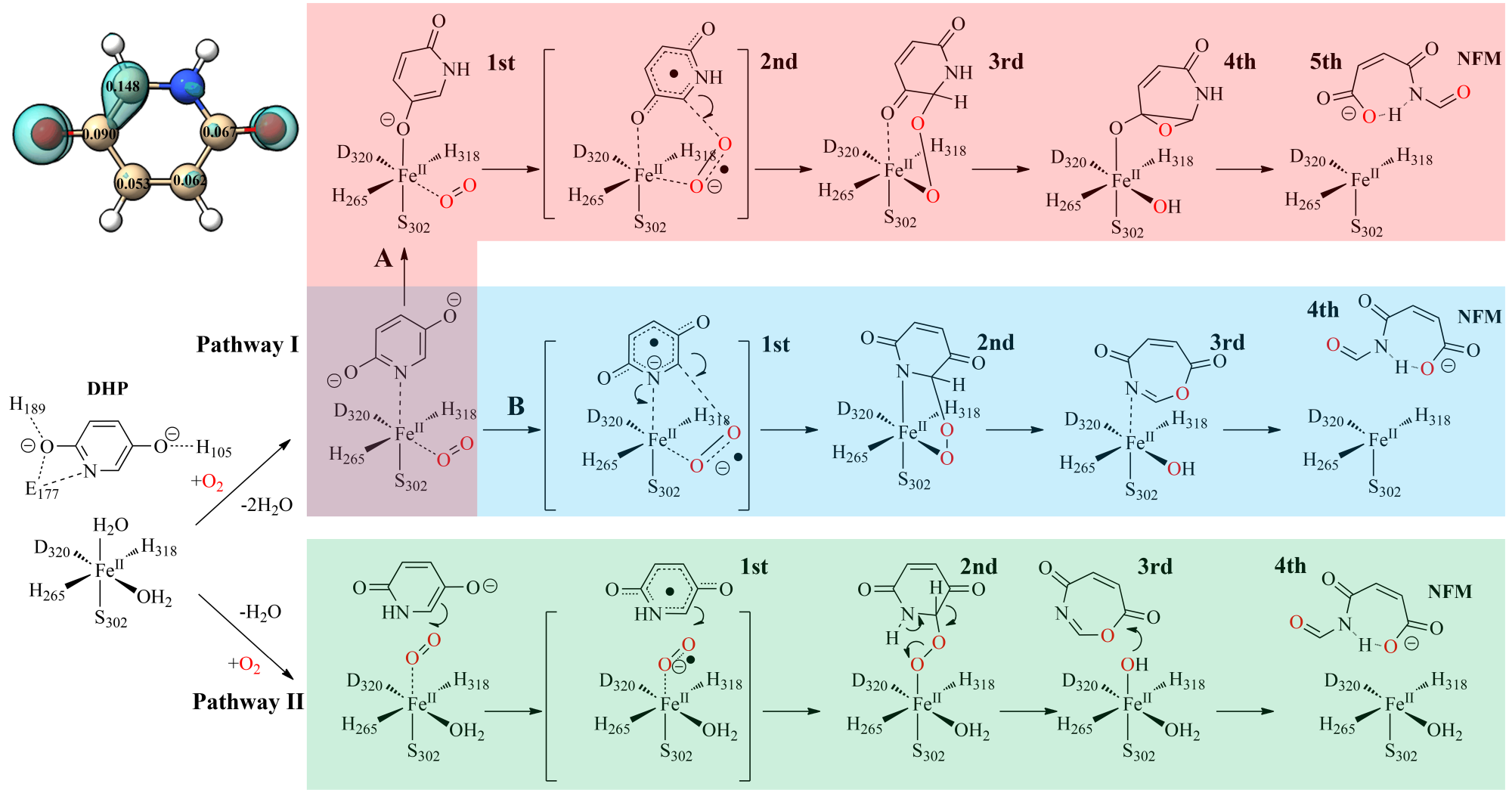 本研究解析了NicX单体及NicX与小分子底物DHP及产物NFM的复合物结构。晶体结构显示NicX是以His265, Ser302, His318 和 Asp320配位金属亚铁离子,以Ser作为亚铁离子配体的非血素亚铁双加氧酶结构蛋白还属于首次报道,如果将这四个残基突变则会使酶失去结合金属亚铁离子的能力。将静息状态的酶同酶结合底物、酶结合产物的结构比较发现,氨基酸残基Leu104-His105在催化反应进程中,起到结合且稳定底物的作用,通过构象的变化会关闭通道II,同时开启一条通往活性中心的疏水性通道。进一步结合QM/MM计算分析,提出了氧气结合顶端位置的催化机制:氧气结合在底物和亚铁离子之间,通过底物吡啶环上的N-H参与质子转移激活氧气分子,促使氧气进攻底物,随后O-O键的断裂而使其中一个氧原子插入吡啶环形成七元环中间体,后续七元环开环生成产物。