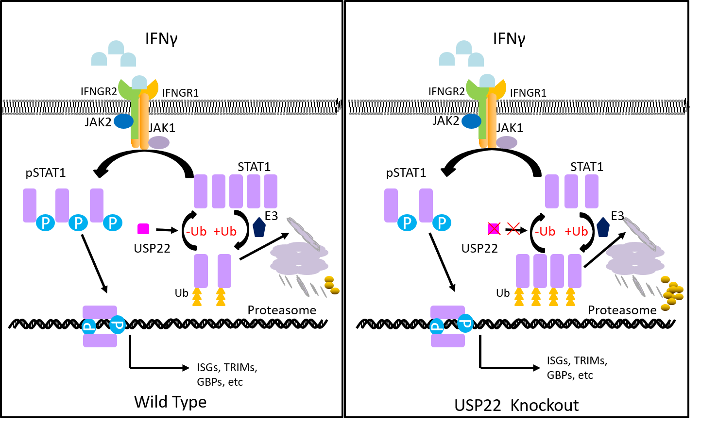 研究者在小鼠黑色素瘤细胞B16-OVA中用CRISPR-Cas9介导的全基因组敲除技术构建了全基因组敲除的细胞模型,并通过OT-I T细胞体内、体外杀伤筛选出潜在的耐受基因USP22。进一步探究其耐受机制发现,USP22通过去泛素化增强STAT1的稳定性,进而调控IFNγ-JAK1-STAT1信号通路。同样,USP22在人的黑色素瘤细胞中也通过去泛素化增强STAT1的稳定性。