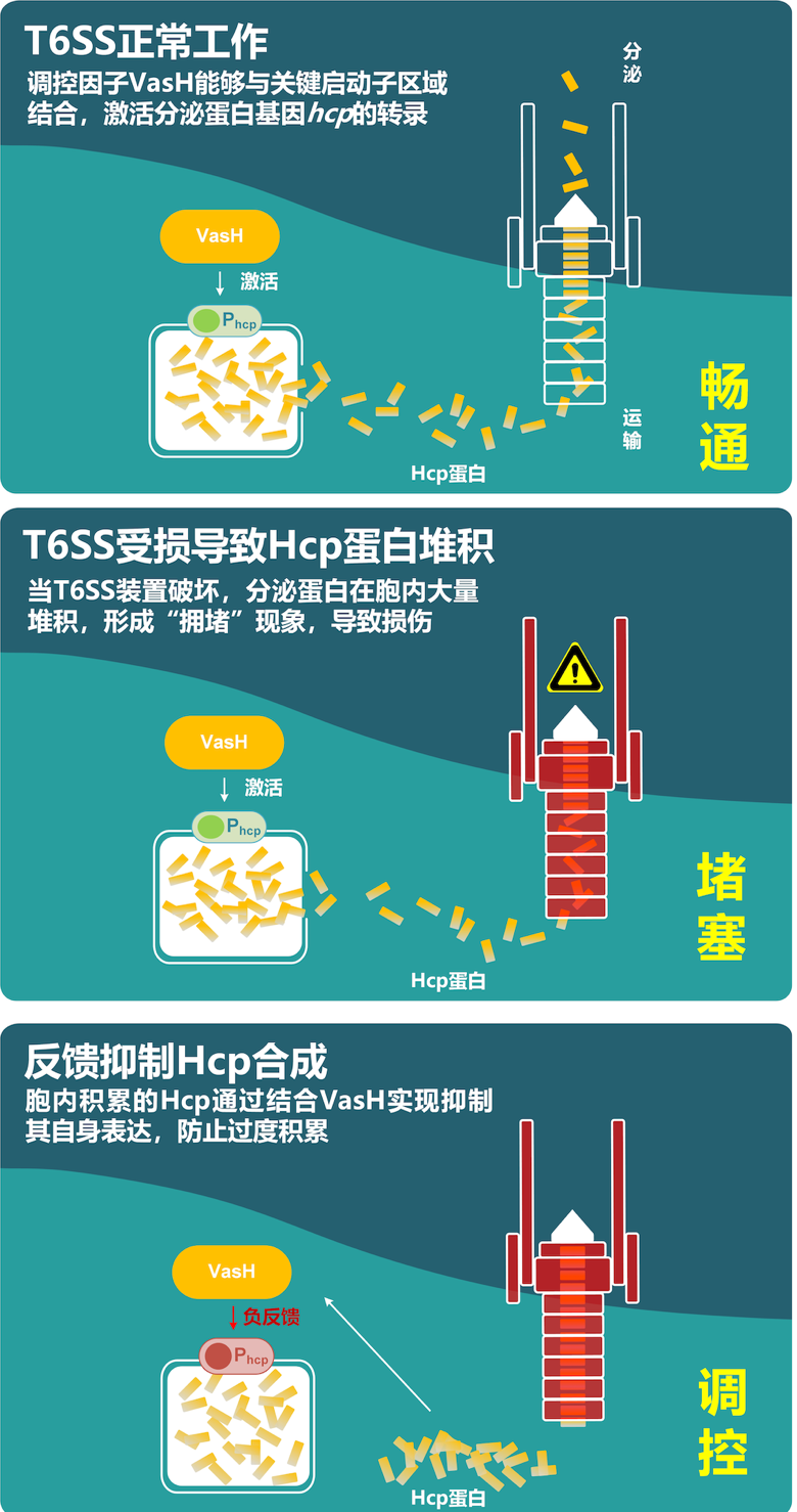 本研究以条件致病菌霍乱弧菌V52的T6SS为研究对象,发现在T6SS失活突变株中,被分泌的内管蛋白表达量被抑制,而可循环利用的外管组分的表达不受影响。通过体内体外实验相结合,作者发现,调控因子VasH不仅能够通过与关键启动子区域结合,激活分泌蛋白基因hcp的转录,还能够与Hcp蛋白直接结合,实现反馈抑制。因此,当T6SS的结构遭到破坏或分泌发生异常时,VasH通过感应胞内Hcp的水平,抑制hcp的持续表达,从而避免其过量积累。类似的调控机制也在其他的霍乱弧菌菌株以及铜绿假单胞菌和气单胞菌等致病菌中得到了验证。