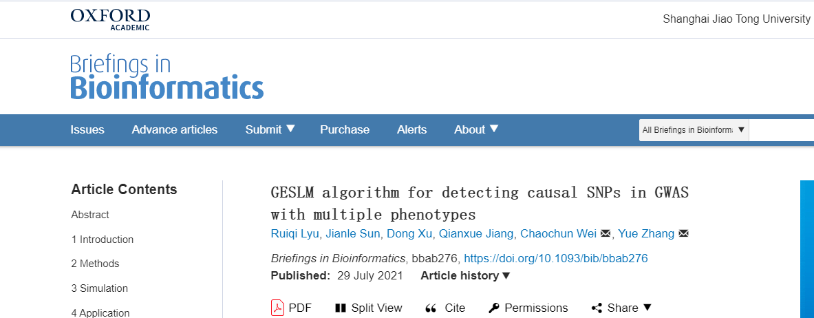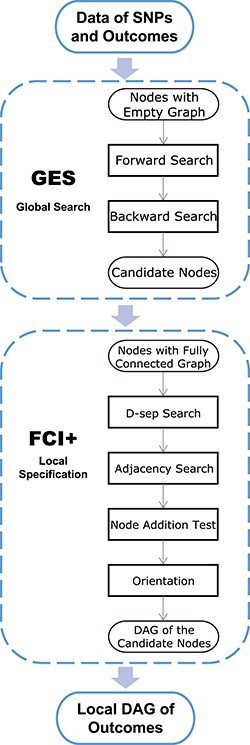 近日,det365登录网站主页生物信息学与生物统计学系、上海交大-耶鲁生物统计与数据科学联合中心团队在《Briefings in Bioinformatics》(IF: 11.622)上发表题为“GESLM algorithm for detecting causal SNPs in GWAS with multiple phenotypes”的全基因组关联分析算法论著。det365登录网站主页在读三年级本科生吕瑞祺为第一作者,det365登录网站主页韦朝春教授和张岳副研究员为共同通讯作者,det365登录网站主页生物信息学与生物统计学系为该文章第一通讯单位,det365登录网站主页四年级本科生孙健乐、三年级本科生徐栋和蒋千雪为共同作者。该研究主要基于第一作者作为det365登录网站主页2020年 iGEM软件队(SJTU-software)队长期间的工作,所有共同作者均为本科生。本研究开发了一个全基因组关联分析的两阶段全局搜索算法,通过贪婪等价搜索(Greedy Equivalence Search, GES)和基于约束的局部修改(Fast Causal Inference+, FCI+),以实现对多表型相关的单核苷酸多态性(single-nucleotide polymorphisms, SNPs)的有向无环图的全局搜索。