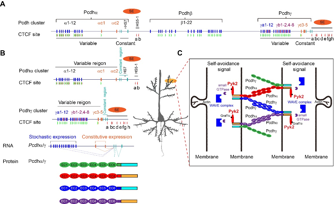 在小鼠中,58个原钙粘蛋白基因形成三个串联排布的基因簇:Pcdhα、Pcdhβ、Pcdhγ,其中Pcdhα、Pcdhγ由可变外区显子和恒定区外显子编码,而Pcdhβ只由可变区外显子编码,它们主要表达在大脑中,在大脑神经网络的特异性连接中起到重要作用(图1A)。原钙粘蛋白的表达受增强子的调控,CTCF/cohesin通过染色质环挤出方式介导启动子和增强子的远程互作,使得单个神经元能够选择性表达不同组合的原钙粘蛋白质群,形成单个神经元特异性的身份标签密码(图1B)。每个神经元通过不同的身份标签识别“自我”和“非我”,进而确保神经元之间能够正确的形成连接(图1C)。