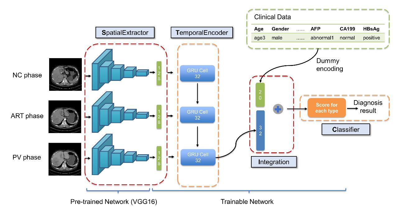 研究者提出的STIC模型以多期造影增强CT和临床特征作为输入,最后输出每类肝恶性肿瘤的分值,其框架包含四个不同的模块。SpatialExtractor模块利用卷积神经网络(CNN)提取CT的空间特征,TemporalEncoder模块使用门控循环神经网络(RNN)挖掘不同期CT之间的变化模式,Integration模块将提取到的影像特征与临床特征融合,Classifier模块通过softmax激活函数实现分类任务。