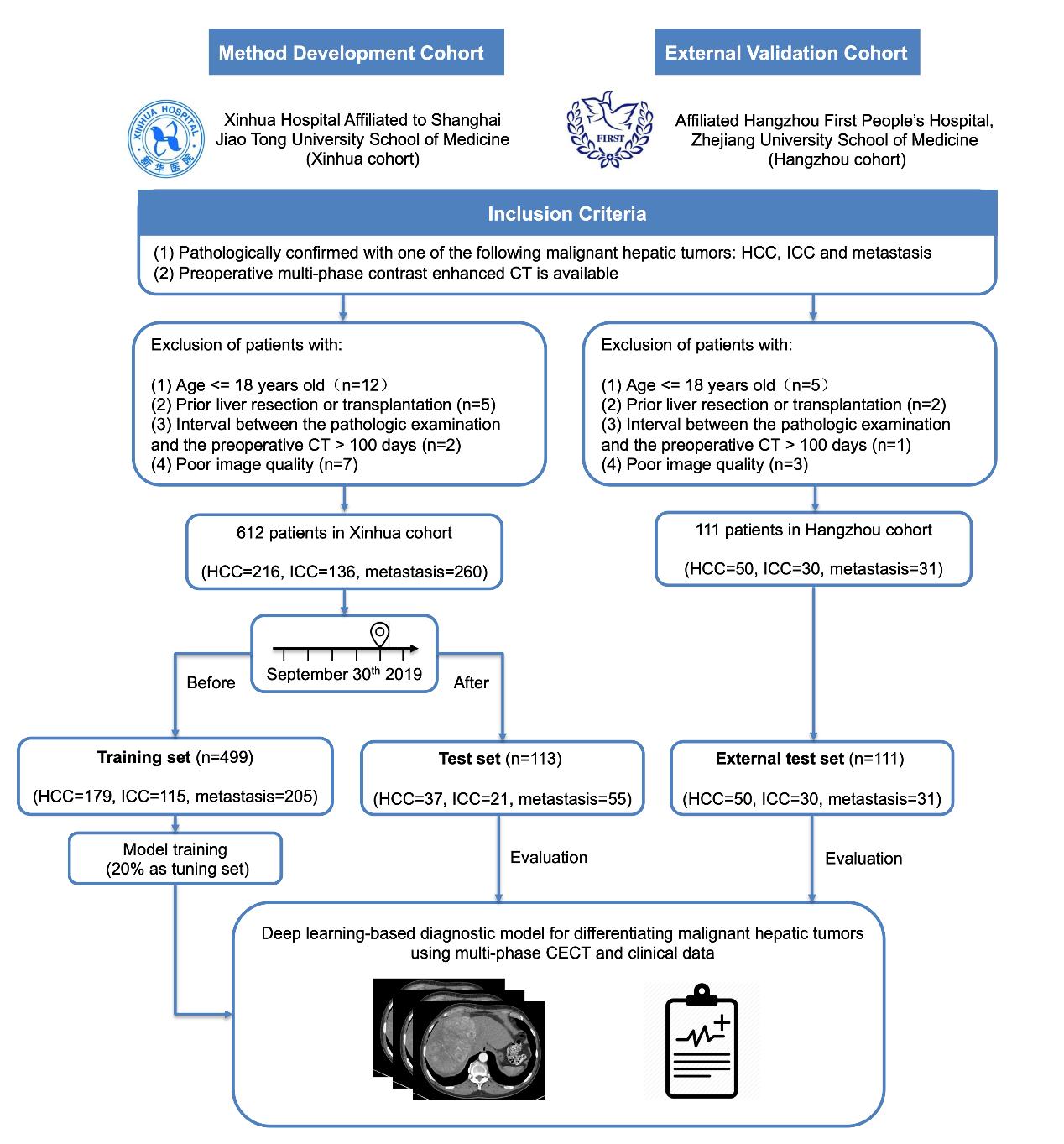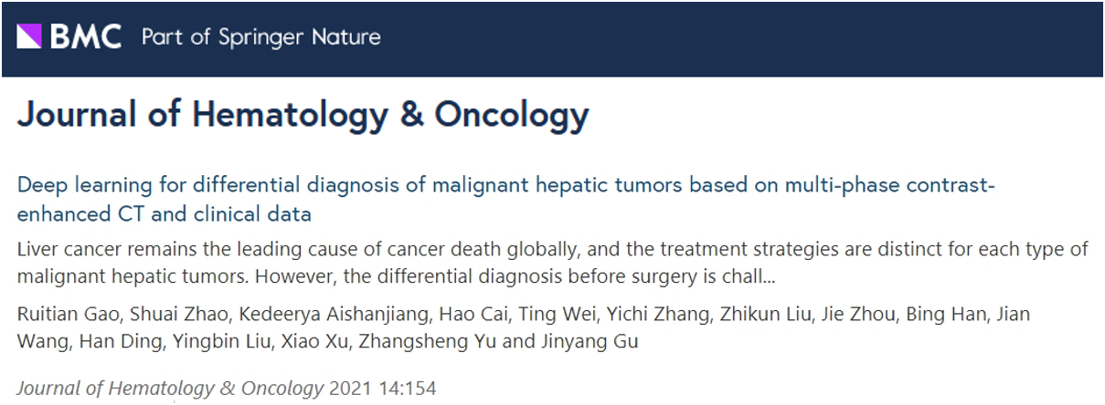 肝恶性肿瘤包括肝细胞癌(HCC)、肝内胆管细胞癌(ICC)和转移性肝癌等,是常见且预后极差的恶性肿瘤。影像学诊断为治疗决策和预后判断提供了不可或缺的支持,然而不同肝恶性肿瘤通过影像学诊断常有误诊。临床上不同肝恶性肿瘤的治疗策略差异巨大,医生在手术、靶向、免疫等治疗前对患者肿瘤类别的准确诊断至关重要。2021年9月26日,医学院附属新华医院顾劲扬教授团队、det365登录网站主页俞章盛教授团队、杭州市第一人民医院徐骁教授团队、医学院附属仁济医院刘颖斌教授团队合作在国际血液病学和肿瘤学知名期刊Journal of Hematology & Oncology上发表了题为“Deep learning for differential diagnosis of malignant hepatic tumors based on multi-phase contrast-enhanced CT and clinical data”的研究成果,提出了一种运用深度学习基于患者术前多期造影增强CT和临床数据对肝脏恶性肿瘤进行判别的智能诊断系统,达到与资深放射科医生相当的判别水平。更可喜的是,在该系统辅助下,放射科医生诊断准确率得以提升,结果在多中心数据中得到验证。该系统可以作为辅助诊断工具,指导医生鉴别肝恶性肿瘤,有望为医疗欠发达地区提供强有力的影像学诊断支持,并提高三甲医院放射科的诊断准确率,为肝癌患者制定最佳治疗方案,促进肝癌的精准治疗。
