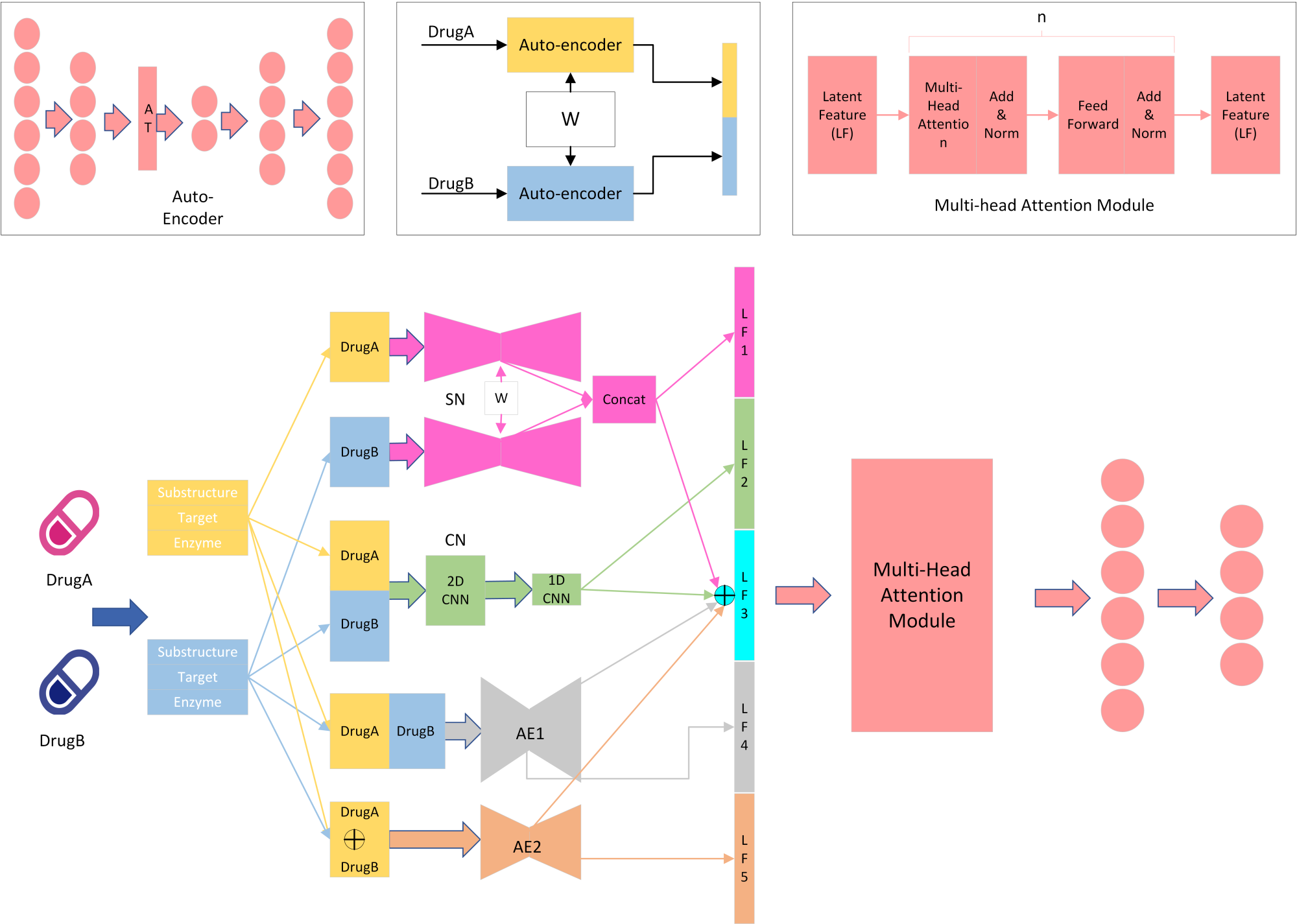 MDF-SA-DDI药物相互作用预测模型架构