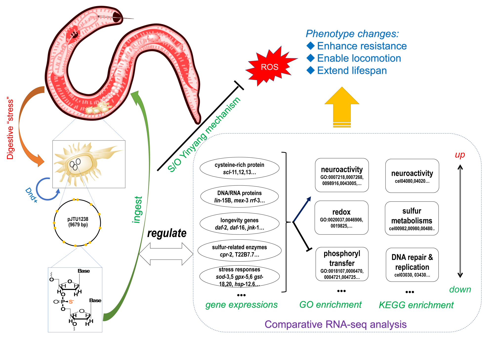 微生物组学分析表明人类肠道微生物群中存在大量的硫修饰细菌,然而它们对宿主的潜在作用尚不明确。赵一雷研究团队从测量线虫体内的ROS水平入手,发现长期进食硫修饰细菌的低龄线虫体内活性氧水平显著下降,特异性荧光探针实验表明过氧亚硝酸类ROS分子下降最为明显。同时,它们的衰老标志物脂褐素水平也随之下降,但个体活动度上升、寿命延长。对百草枯、重金属铬离子、热激等急性氧化胁迫的抵抗力也获得了增强。差异转录组学测序分析表明进食活跃的年轻线虫体内多达上百种基因表达被显著调控,包括抗ROS基因sod-3、热激蛋白 hsp12.6、谷胱甘肽硫转移酶基因(GSTs)、寿命调节基因jnk-1等都发生了显著变化,这些受调控的基因富集在蛋白磷酸化、神经受体、DNA复制修复等生物过程,极有可能影响了daf-16基因相关的胰岛素信号通路。