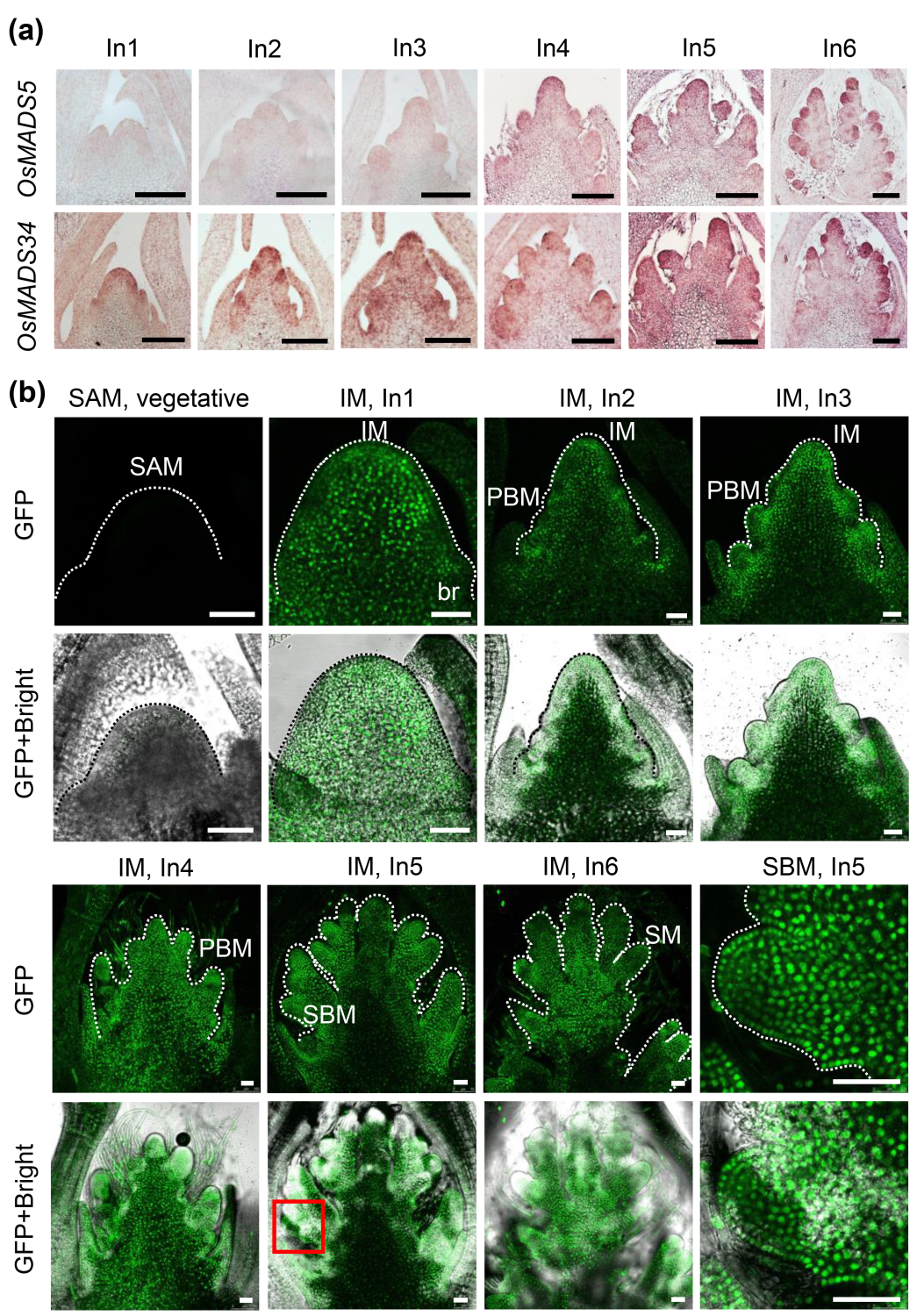 (a)OsMADS5和OsMADS34在In1-In6期野生型花序原基中的原位杂交分析;(b)OsMADS34融合GFP蛋白在营养生长期到生殖生长期分生组织中的定位。