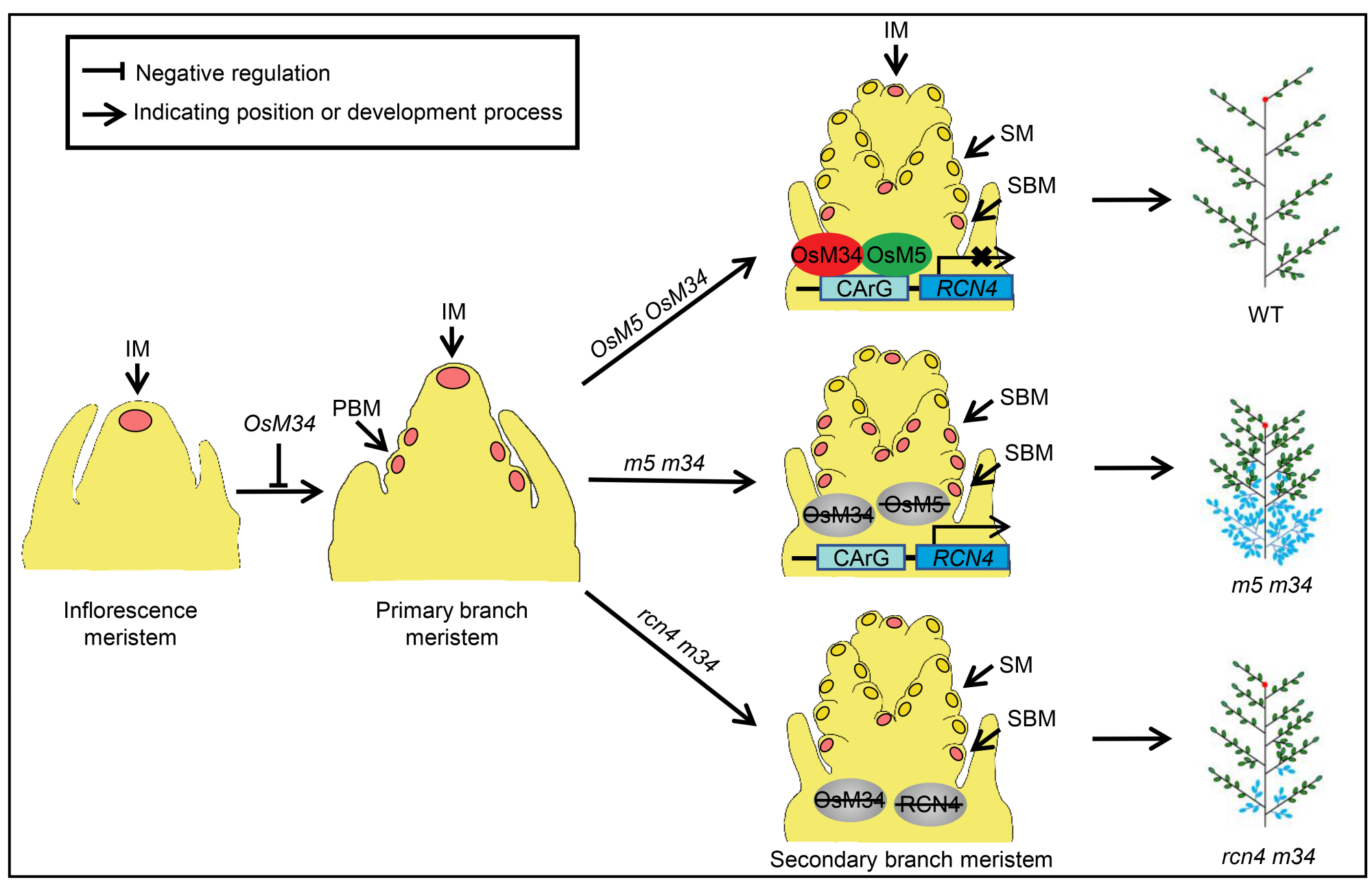 根据以上结果,作者进一步提出了本文模型(图2),即OsMADS5与OsMADS34能够协同调控水稻花序发育。OsMADS5和OsMADS34通过协同抑制RCN4的表达,在限制穗分枝及促进小穗分生组织特性转变方面起着相似的作用。本研究为更好地理解水稻花序结构的分子调控机制,提供了新的见解。