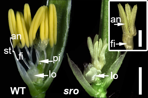 本研究从60Co γ-射线诱导粳稻亚种9522建立的突变体库中分离到了雌雄不育的单隐性突变体sro。与野生型花器官相比,sro突变体雄蕊和雌蕊明显变小,花丝部分或完全融合在异常伸长的花轴上面,暗示SRO基因在调控水稻生殖器官大小和分离中起重要作用。此外组织形态学分析表明sro生殖器官大小的改变是由细胞数目和细胞大小的共同变化引起的。
