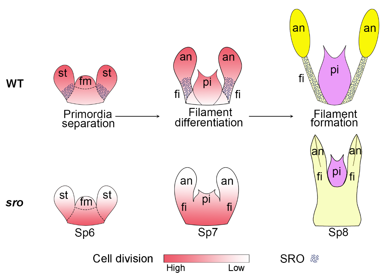 本研究采用图位克隆的方法分离了SRO基因,它编码一个核定位的C2H2型锌指蛋白,是拟南芥转录因子SUPERMAN(SUPERMAN在控制雄蕊和心皮边界的建立和胚珠的发育中起重要作用)的同源基因,两者具有部分保守的表达、功能和调控网络。SRO在雄蕊花丝发育的起始阶段特异表达,通过抑制花丝的细胞分裂,自主性的调节花丝的正确形成和分离,而非细胞自主性的调节雄性和雌性生殖器官的大小(见图2模式图)。转录组分析表明SRO影响水稻花中与细胞分裂、细胞扩张和植物激素信号有关的基因。此外,遗传学分析表明水稻花器官B类基因OsMADS16/SPW1对SRO具有上位性,而SRO与C类基因OsMADS3和OsMADS58协同调节生殖器官和花分生组织发育。总之,本研究通过发育、遗传、组织学和转录组学分析,系统揭示了SRO调控生殖器官大小和器官分离的分子机理,拓展了人们对水稻生殖发育过程中器官形态建成的认识。