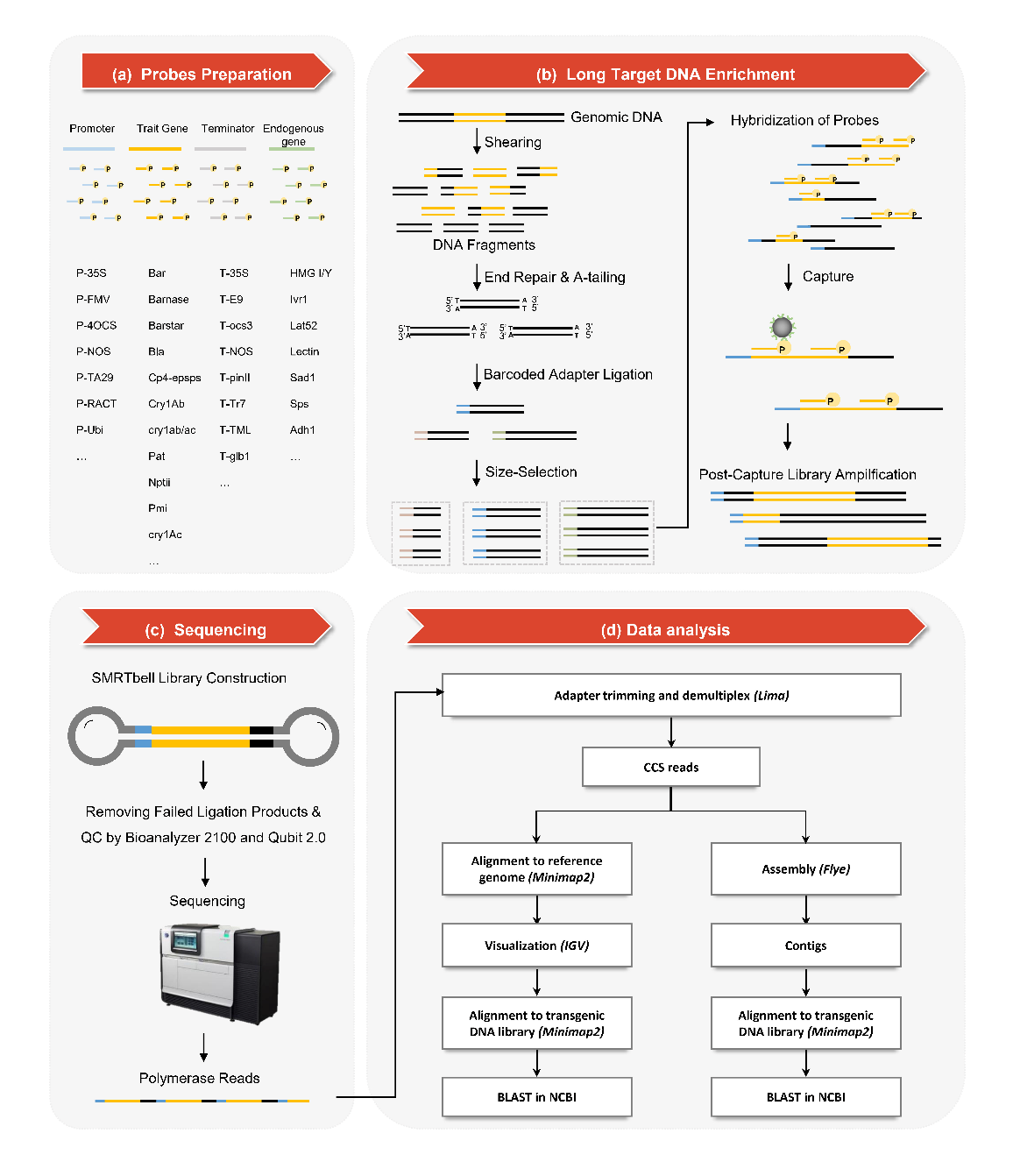 该研究首先从团队前期建立的转基因生物检测方法数据库(GMDD)中,筛选主要常用的转基因元件、外源基因、物种内标准基因等构建序列数据集,设计了一套高覆盖率的寡核苷酸探针库,可以覆盖99.1%的商业化转基因作物;然后利用液相杂交富集捕获转基因生物基因组中含有外源DNA序列的大片段;最后利用PacBio测序获得捕获的大片段DNA的具体序列信息,构建了长片段序列分析算法,实现对外源DNA整合位点、方式、结构和旁侧序列的完整破译。