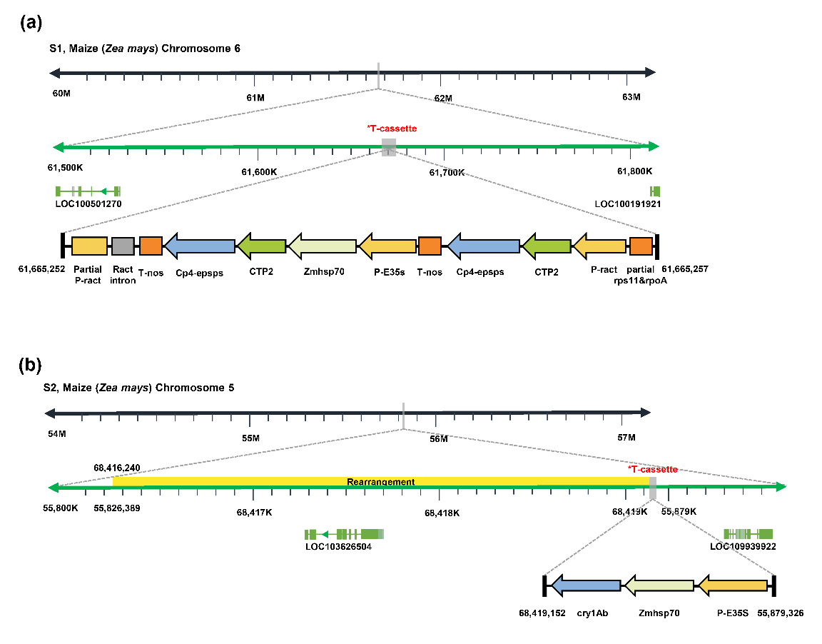 图2.转基因玉米NK603(S1)和MON810(S2)中转基因整合结构示意图
