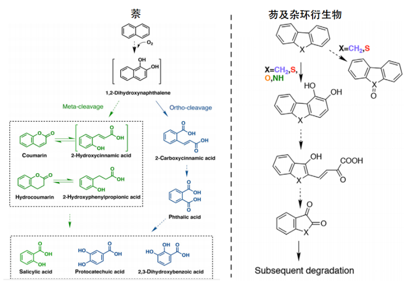 图1.解氢芽孢杆菌N12代谢萘、芴及其杂环化合物的途径(Qiu et al., 2022)