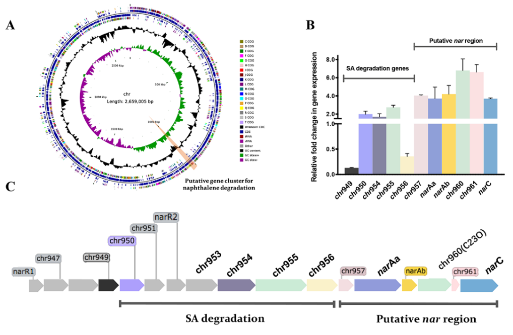 图2.解氢芽孢杆菌N12的全基因组及萘代谢基因簇。菌株N12全基因组圈图(A);推测的萘代谢基因簇的荧光定量PCR验证(B);推测的萘代谢基因簇(C)(Qiu et al., 2022)
