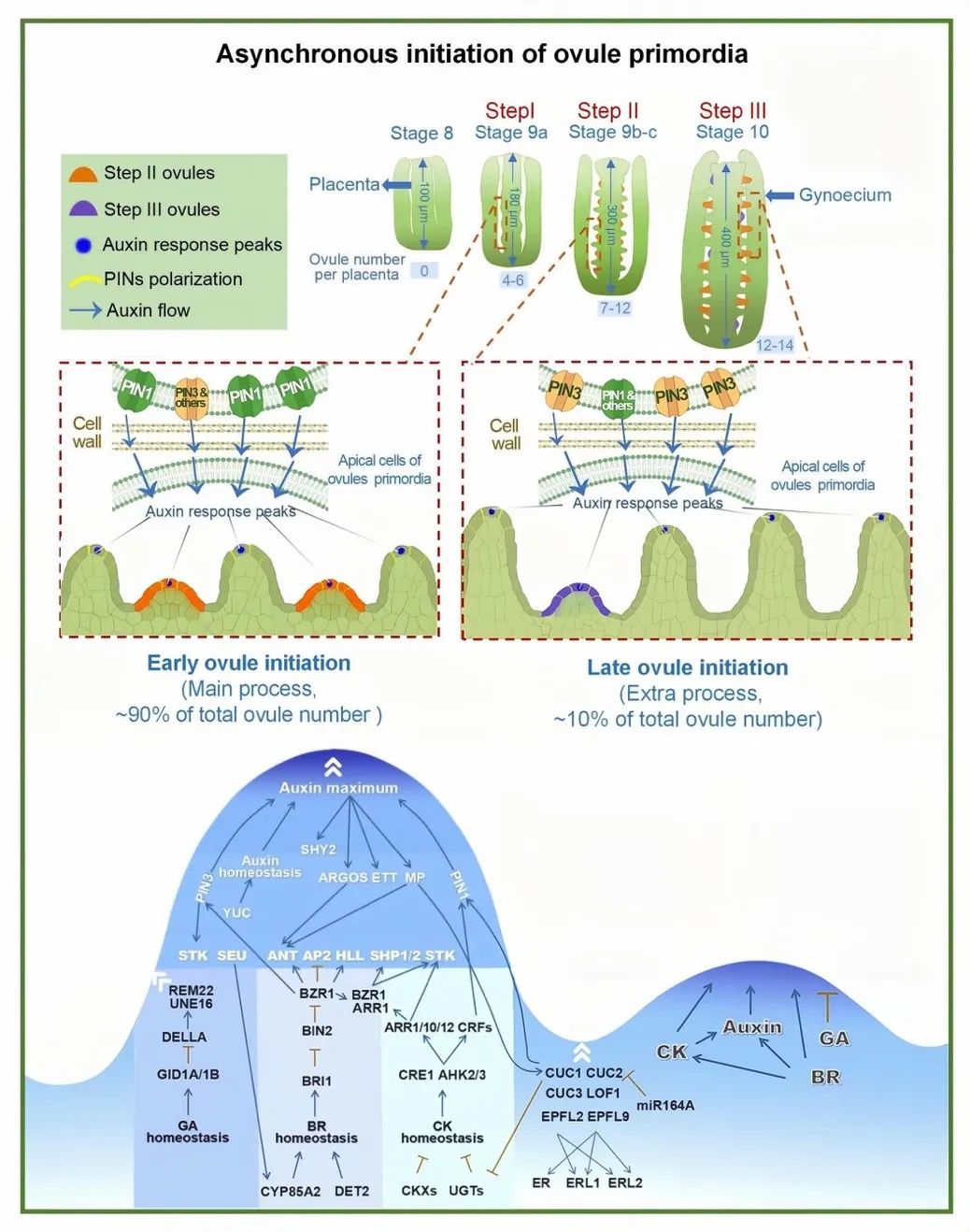 该论文系统总结了拟南芥胚珠发生的规律和机制,分别从胚珠发生前、胚珠发生时以及胚珠发生后三方面进行阐述,首先梳理了参与胎座形成和胚珠决定(胚珠发生的前提)的重要基因和信号;接着阐述了多胚珠原基群体起始的规律,并详细总结了植物激素及其信号互作调控胚珠发生的功能和机制;随后简要概述了胚珠发生后续的发育过程(胚珠发育、胚珠中雌配子体发育、受精过程、合子发育等)以及这些过程对植物后代数量的影响。最后提出了胚珠发生研究中尚未解决的问题,如胚珠发生的根本问题(原初信号)、胚珠发生的终止信号、是否存在第一个胚珠(the primary ovule,元珠猜想)等;并展望了该领域的未来研究热点(技术革新、环境影响、植物不同侧生器官发生的机制比较、动植物器官/形态特征均匀排列的机制比较等),以及该领域研究在提高多胚珠子房农作物产量中的应用前景。