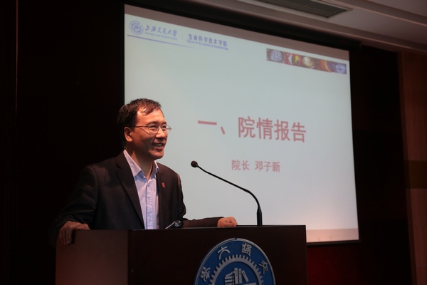 院长邓子新代表学院从学科基地建设、师资队伍建设、教学人才培育、科学研究、国际化建设和党建文化建设六个方面进行了院情报告。他表示,学院能够在短期时间内取得现在的成绩,离不开所有生科人的共同努力,同时也感谢老领导和校友们在发展过程中给予学院的支持。