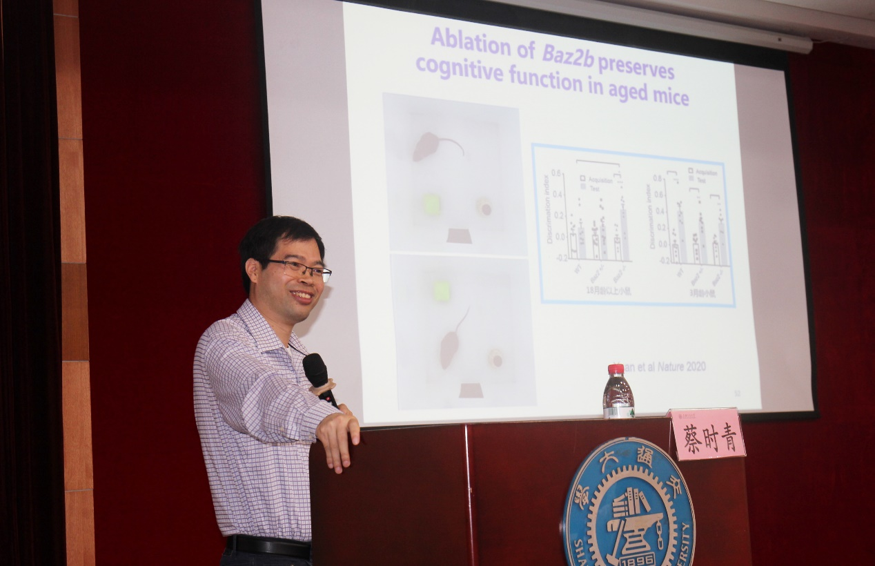 研究表明,寿命和健康寿命可由不同机制调控,因此延长寿命不再是抗衰老的唯一目标,寻找有效途径来延缓行为和认知等功能退化已成为衰老研究领域中的关键点和难点。主题报告环节,蔡时青介绍了课题组阐明了神经递质在动物衰老过程中的重要作用,发现寿命调控机制和衰老过程中行为退化调控机制不尽相同。并且通过分析个体衰老速度差异的遗传基础,发现BAZ2B和EHMT1是重要的调控行为和认知衰老进程的因子,可能是全新抗衰老靶标基因。