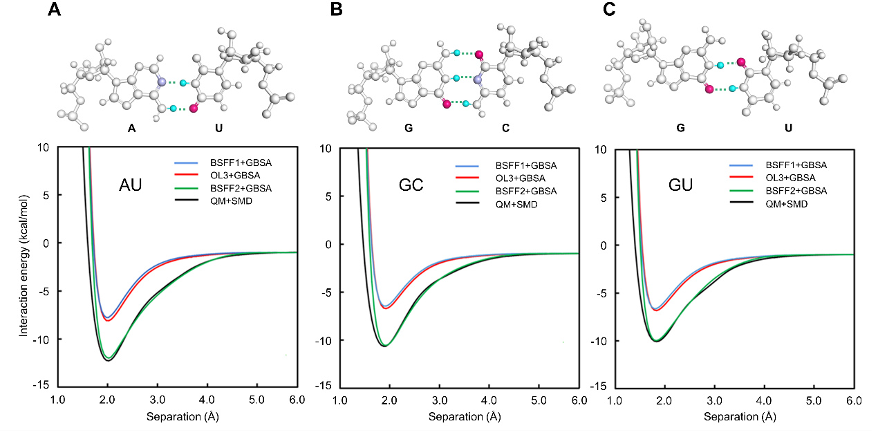 RNA动态构象系综是其发挥转录、翻译、催化等多种多样的生理功能的基础,当前实验方法难以精准解析,因此分子动力学模拟成为了重要研究手段。分子力场决定了分子动力学模拟的精度,然而现有RNA分子力场存在诸多不足。此前陈海峰课题组已开发多种改进RNA分子力场,本次研究提出的BSFF2是在此前BSFF1研究基础上进一步优化主链结构同时引入二级结构配对能量校正项(图1),从而更为精准的捕获RNA动态构象信息。