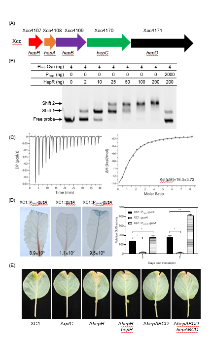 野油菜黄单胞菌野油菜致病变种(Xanthomonas campestris pv. campestris, Xcc)是十字花科植物黑腐病的病原菌。在Xcc侵染过程中, 植物侵染部位会大量合成水杨酸(Salicylic acid,SA), 诱导植物产生免疫反应,抵抗病原菌的侵染。寄主植物合成的SA能否作用于入侵的病原菌及其作用机理研究有待进一步研究。该研究以Xcc致病株XC1为研究对象,首先通过RNA-seq分析发现了基因簇hepRABCD的表达受SA显著诱导表达,其中hepR编码一个MarR家族转录因子,hepABCD编码一个RND-家族外排转运系统。HepR特异性结合hep基因簇启动子的一个富含AT区域,负调控hepABCD的表达。HepR是一个新型SA感应蛋白,SA与HepR结合诱导HepR从hep基因簇启动子区域释放出来,进而诱导hepABCD的表达。HepABCD负责SA的外排,并且参与调控胞内pH和DSF信号依赖的群体感应机制;此外,hepABCD的缺失降低了XC1侵染甘蓝和大白菜的致病性。该论文是继2022年宿主植物水杨酸信号诱导Xcc降解DSF分子机制的进一步深入研究,丰富了宿主植物防御信号水杨酸的生理功能。研究论文“The phytopathogen Xanthomonas campestris senses and effluxes the defense signal salicylic acid via a sensor HepR and an RND family efflux pump to promote virulence in host plants”发表在中国科学院微生物研究所和中国微生物学会共同主办的微生物学综合期刊《mLife》上。det365登录网站主页助理研究员宋凯为该论文的第一作者,何亚文教授及广西大学姜伯乐研究员为该论文的共同通讯作者。