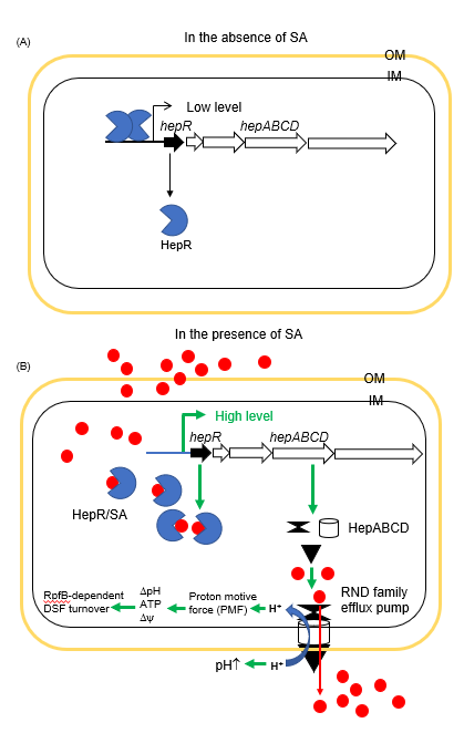 图2 HepR感应SA并激活HepABCD外排水杨酸的分子机制模式图