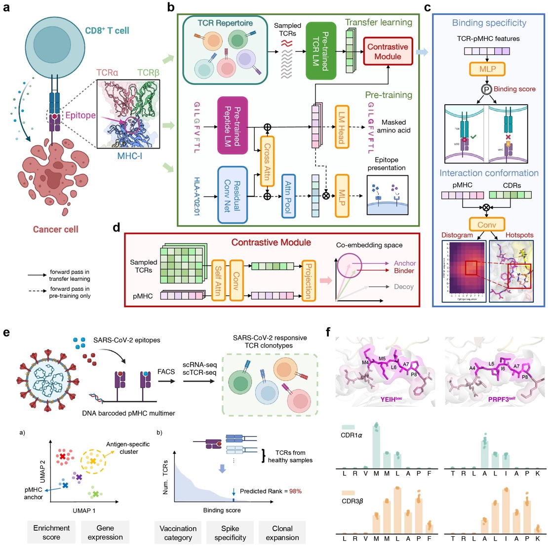 CD8+ T 细胞在对抗病原体感染、癌症和自身免疫疾病中发挥着关键作用:细胞表面的T细胞受体(TCR)通过识别主要组织相容性复合体(MHC)I类分子呈递的抗原表位来激活T细胞,引发适应性免疫反应。准确和高通量地识别与特定抗原表位结合的TCR能够帮助理解T细胞免疫反应的机制,支持开发基于TCR的免疫疗法。尽管单细胞TCR测序技术和四聚体相关TCR测序(TetTCR-seq)等能够产出配对的TCR转录本及其抗原识别的特异性,但这些实验方法仍存在成本高、技术复杂和表位覆盖度有限等问题。因此,研究人员开发了一系列深度学习方法,通过对TCR和抗原表位-MHC复合物(pMHC)的序列建模,旨在预测两者间的结合特异性。然而,现有方法大多仅关注TCRβ链上的互补决定区3(CDR3),且在预测新生抗原(neoantigen)或不常见的抗原表位时效果不佳。
