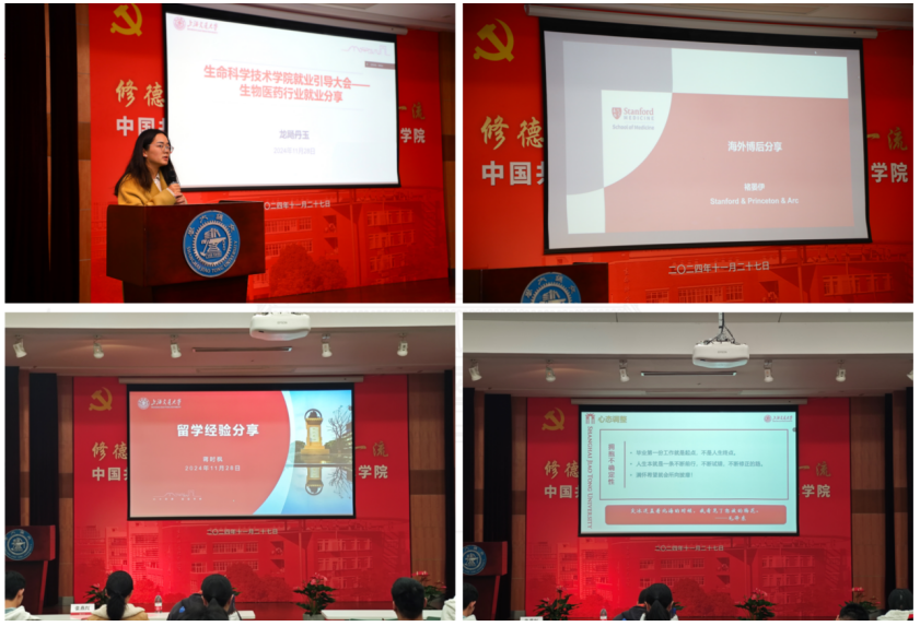 在求职经验分享环节,目前在斯坦福大学攻读博士后的褚晏伊分享了申请流程、导师选择及未来职业方向规划的经验;在约翰霍普金斯大学攻读博士的蒋时枫分享了申请国外博士、国外生活等方面的相关经验;江西省选调生赖宇琴介绍了选调生备考和在基层工作的经历和感悟;就职于光明乳业的龙飏丹玉从生物医药行业的求职经历、面试经验等方面展开分享;在中国科学院攻读博士的王慕瑶分享了申请中国科学院的具体流程、准备材料以及在中国科学院学习生活的感悟。与会同学们认真收听,与学长学姐们进行了深入的交流。