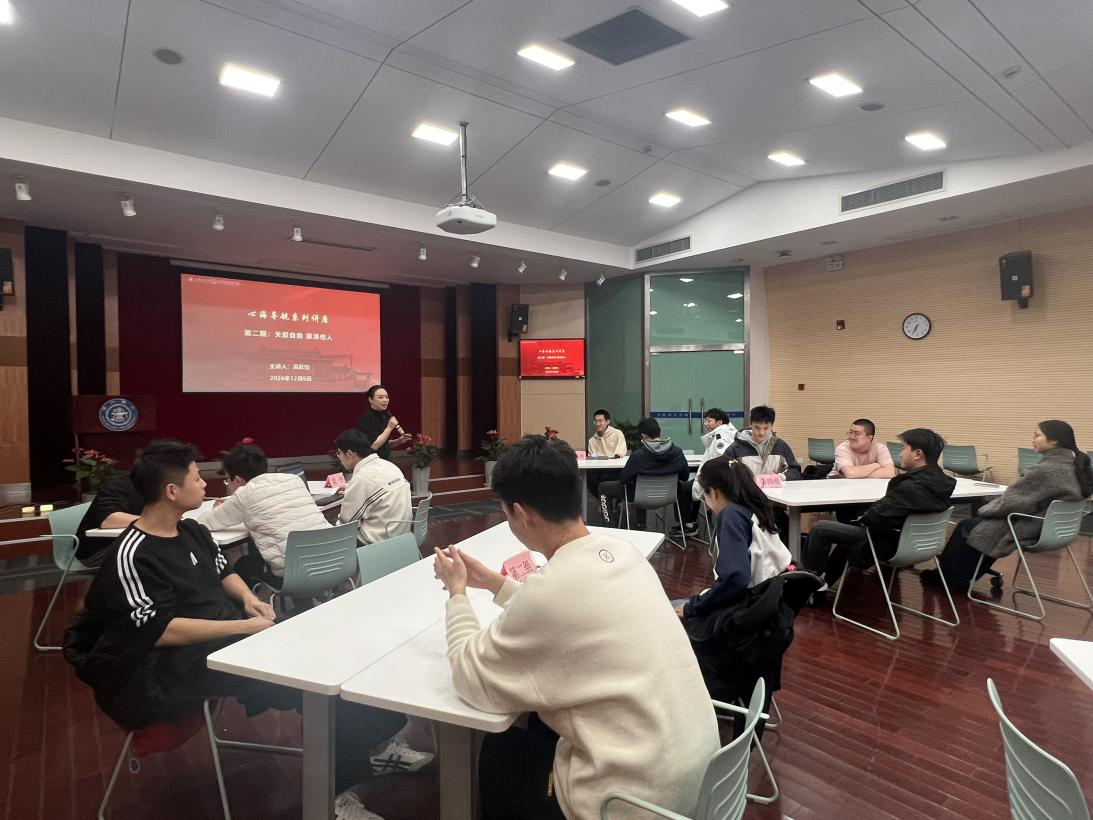 在讲座最后的互动环节,针对同学们比较感兴趣的问题,吴欣怡老师带领同学们进行了互动讨论,大家畅所欲言,积极表达自己的想法。在讨论的过程中,吴老师根据同学们的分享,结合自己丰富的专业知识,为大家答疑解惑,给予了同学们建设性的意见。本次心海导航系列讲座让同学们在互相支持、互相理解中更好地认识了自我,探索内心世界,在交流互动中感受到温暖和力量。